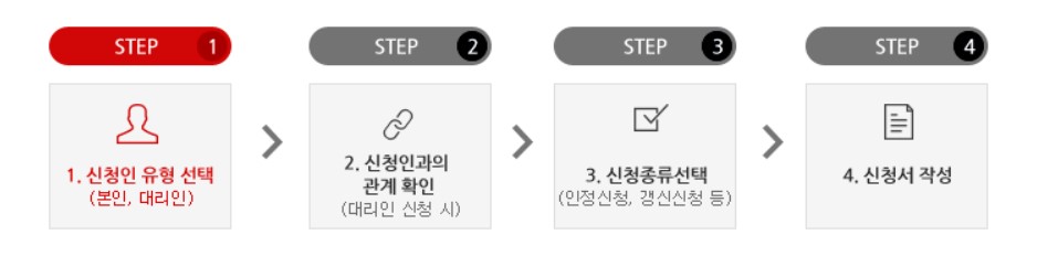 위의 장기요양등급신청하러가기 버튼에 연결된 사이트로 들어가셔서 장기요양인정신청으로 들어가셔서 신청하시면 됩니다. 절차는 다음과 같습니다.
