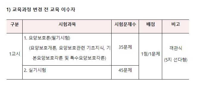 교육이수시간이 늘어난 만큼 시험과목도 변경 전후가 약간 다릅니다. 변경전에는 요양보호개론, 기초지식, 기본요양보호각론, 특부요양보호각론 등을 봤지만 이후에는 요양보호와 인권, 노화와 건강증진, 요양보호와 생활지원 및 상황별 요양보호기술을 시험 보게 됩니다. 기본적인 내용은 비슷하나 이전에 비해 실무적인 내용이 좀더 중요해졌습니다.