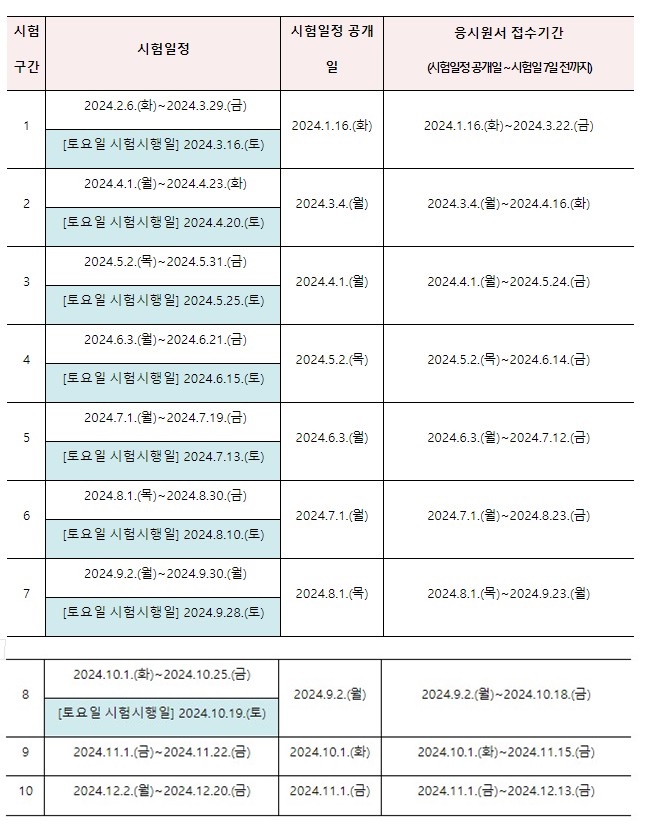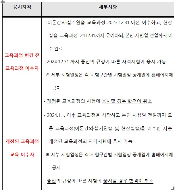 2024년부터 교육을 들으시는 분들은 변경된 지침을 따르시면 되는데, 2023년에 교육과정을 마치고 2024년에 시험을 치르는 분들은 어떻게 하면 될까요? 2023년 12월 31일까지 교육과정을 마친 분들은 2024년 12월 31일까지는 종전 교육과정에 따라 자격시험 응시가 가능하니 걱정 마시고, 시험을 치르시면 됩니다.