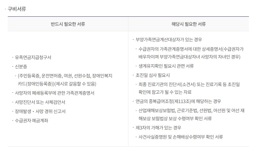 유족연금 구비서류는 유족연금지급청구서, 신분증(주민등록증, 운전면허증, 여권, 선원수첩, 장애인복지